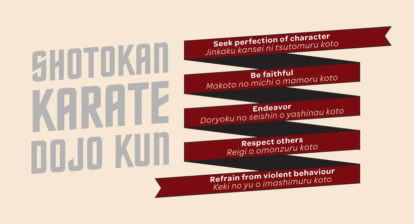 Dojo kun is a Japanese martial arts term literally meaning (training hall) rules. It was created by Sensei Gichin Funkasoshi, the founder of the Shotokan Karate school widely credited with popularising “karate do”. The Dojo kun consists of five equal principles outlining behaviour expected and disallowed and are recited at the end of each karate class. Each start with “Hitotsu!” or “One!” which emphasises that all five bear the same importance and priority.